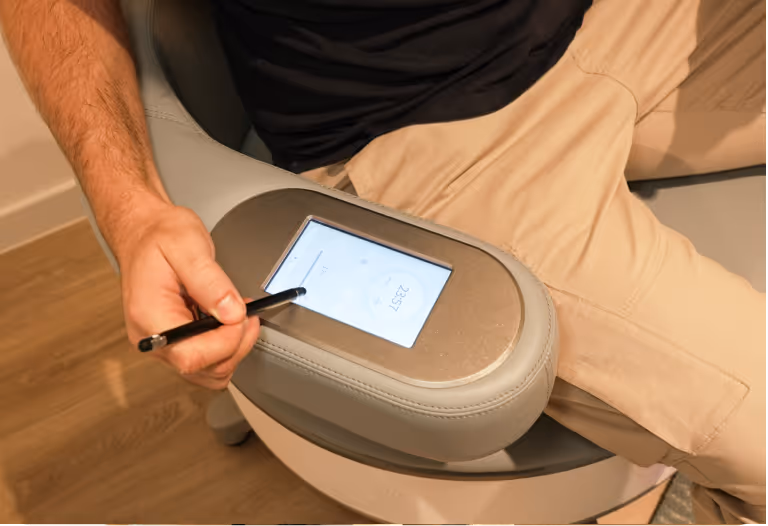 Du nimmst auf dem EMP Chair Pro Platz. Während du ein intensives, aber schmerzfreies Pulsieren spürst, kannst du entspannen, lesen oder Musik hören.